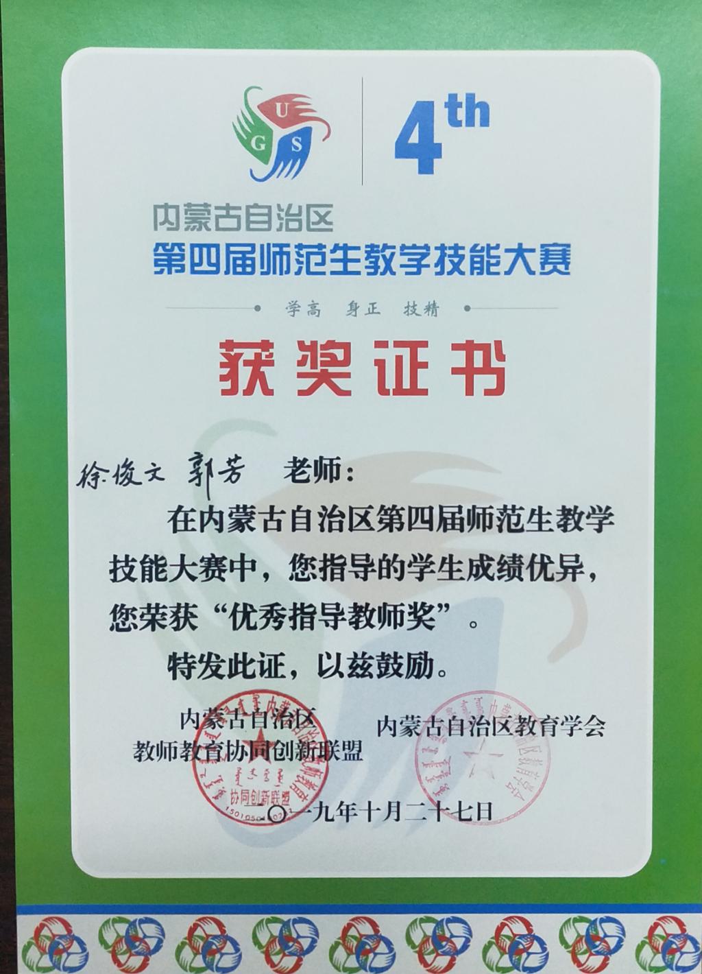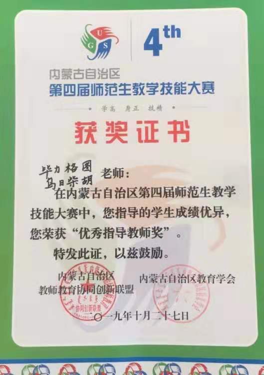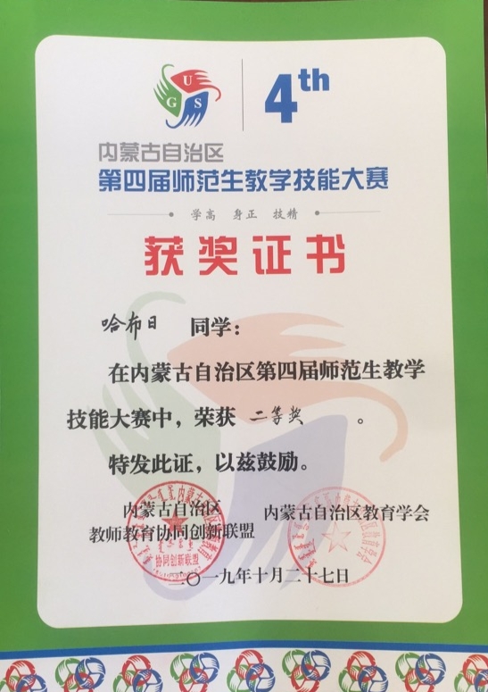 经过几个环节的激烈比拼,beat365取得优异的成绩,荣获beat365中文官方网站优秀指导教师的有毕力格图老师、乌日柴胡老师、徐俊文老师、郭芳老师;尼日嘎拉同学获得数学与应用数学(蒙古语)组一等奖,哈布日同学获得数学与应用数学(蒙古语)组二等奖,孟昆令同学获得数学与应用数学(汉语)组二等奖,王亚菲同学获得数学与应用数学(汉语)组优秀奖。