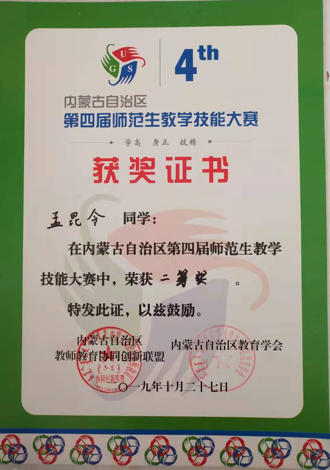2019年10月25日至28日,内蒙古自治区第四届师范生教学技能大赛在内蒙古民族大学举办。此次比赛由内蒙古自治区教师教育协同创新联盟、内蒙古自治区教育学会主办,内蒙古民族大学承办。大赛旨在“以赛促训、以赛促学、以赛促教、赛教结合、提高能力”,培养具有师德高尚、理念先进、能力扎实的优秀教师后备力量。内蒙古自治区第四届师范生教学技能大赛共有来自beat365中文官方网站、包头师范学院、集宁师范学院、呼伦贝尔学院、赤峰学院、呼和浩特民族学院、河套学院和内蒙古民族大学八所院校的160名选手参赛。比赛内容包括笔试和面试两个部分。笔试部分依据中小学教师资格证考试笔试大纲制定,面试部分由教学设计、课件制作、即兴演讲、模拟授课及回答问题等五部分构成。本次比赛进行了现场直播,直播点击量超过41万次。