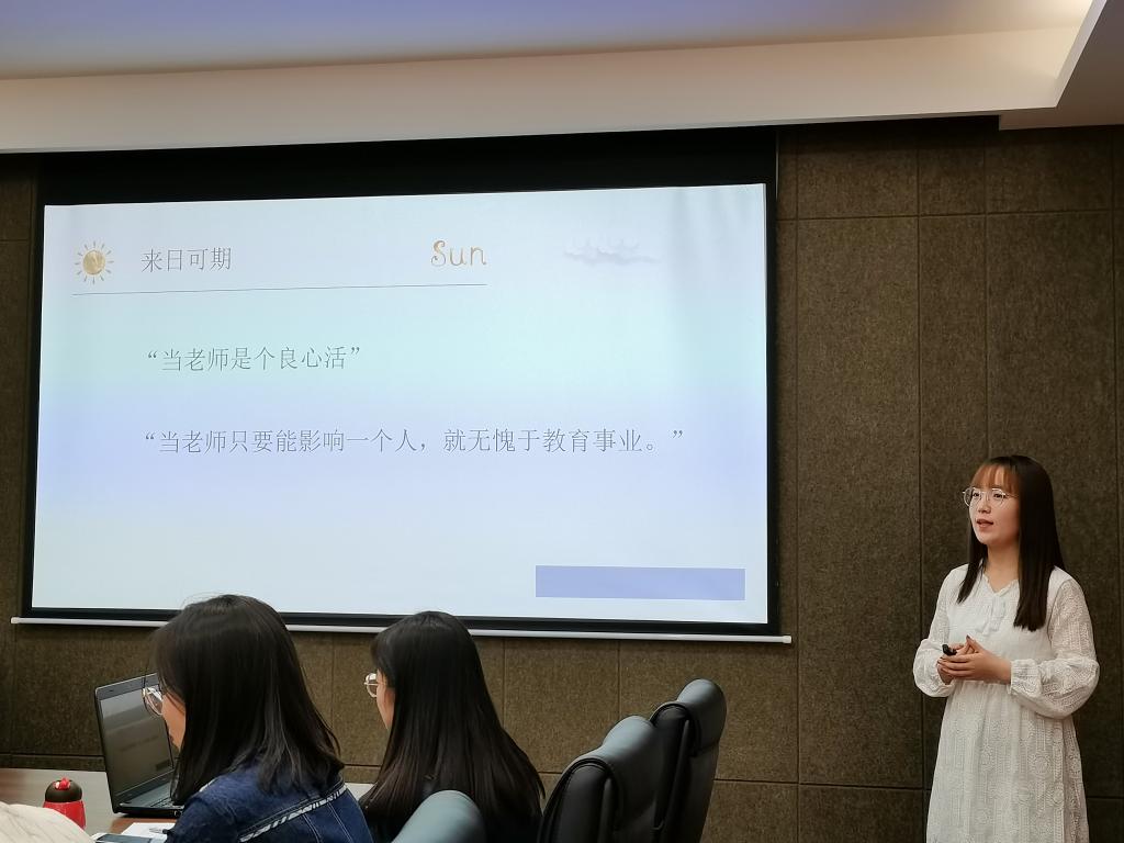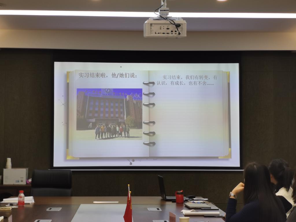 四位实习生代表分别从三个方面报告:一是教学实习方面,包括听课、参加教研活动、课前备课、上台讲课、监考、批作业等;二是在班主任实习方面,参与、组织班会等各种班级活动,分享了自己实习期间的所见所闻;三是分享实习期间的收获与感悟,总结了自己在备课时从慌乱到有条理性、讲课时从紧张到从容等,以及今后还需要继续努力的方向。