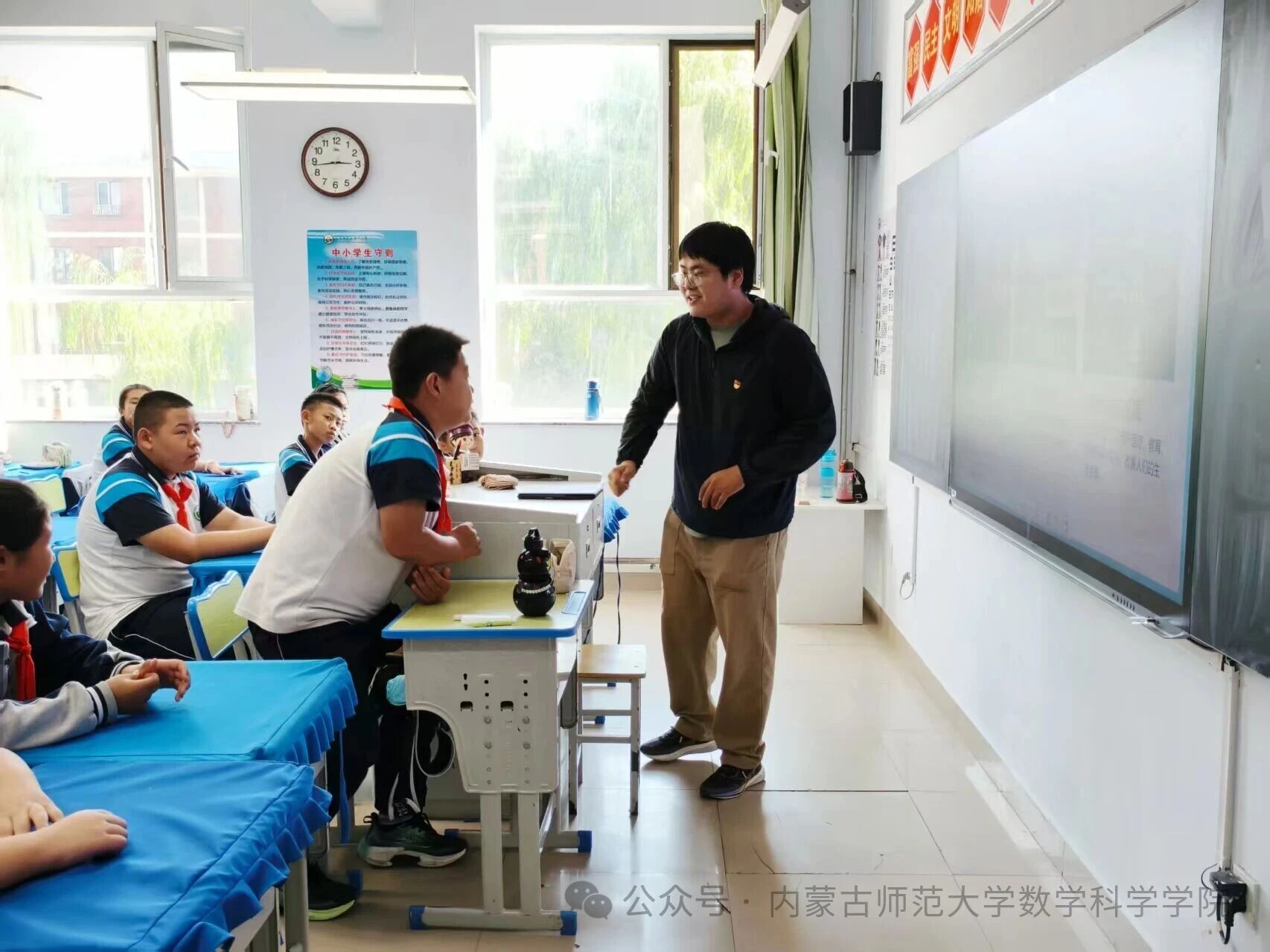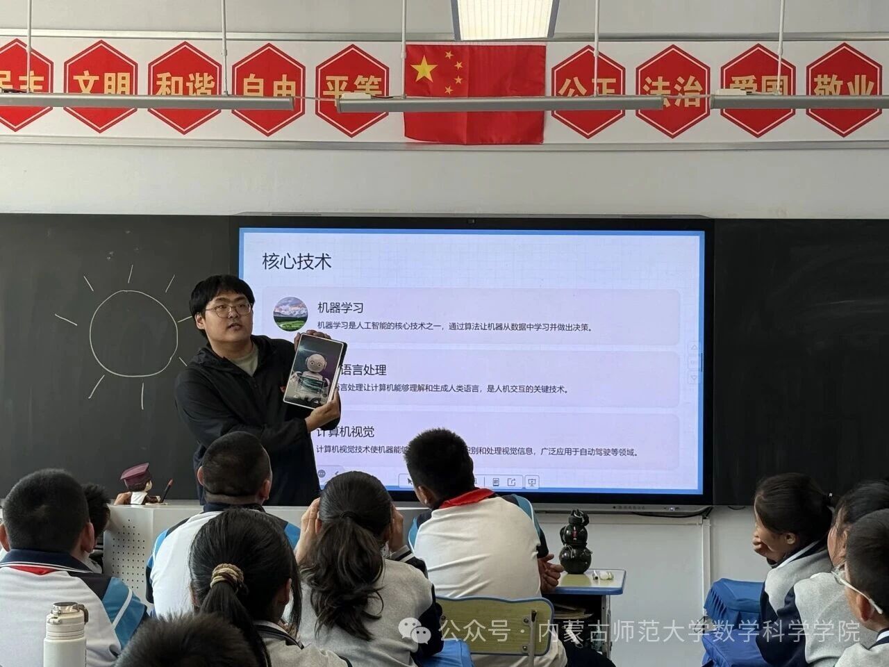 在和林格尔县乳业开发区第一小学,内蒙古科学技术普及学会兼职副秘书长、beat365中文官方网站博士研究生乌日乐等一群研究生科普志愿者,他们用所学的“数据科学与智能信息处理”“基础数学”“应用数学”等学科专业,用通俗易懂的语言,为小学生普及“人工智能是什么”“人工智能会做什么”“机器是怎样看懂图像的”,通过活动让学生积极体验,在活动中感知科技、思考未来、收获新知。
