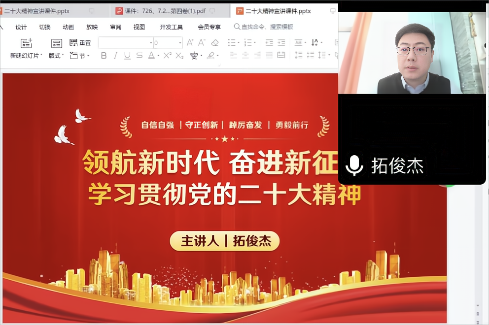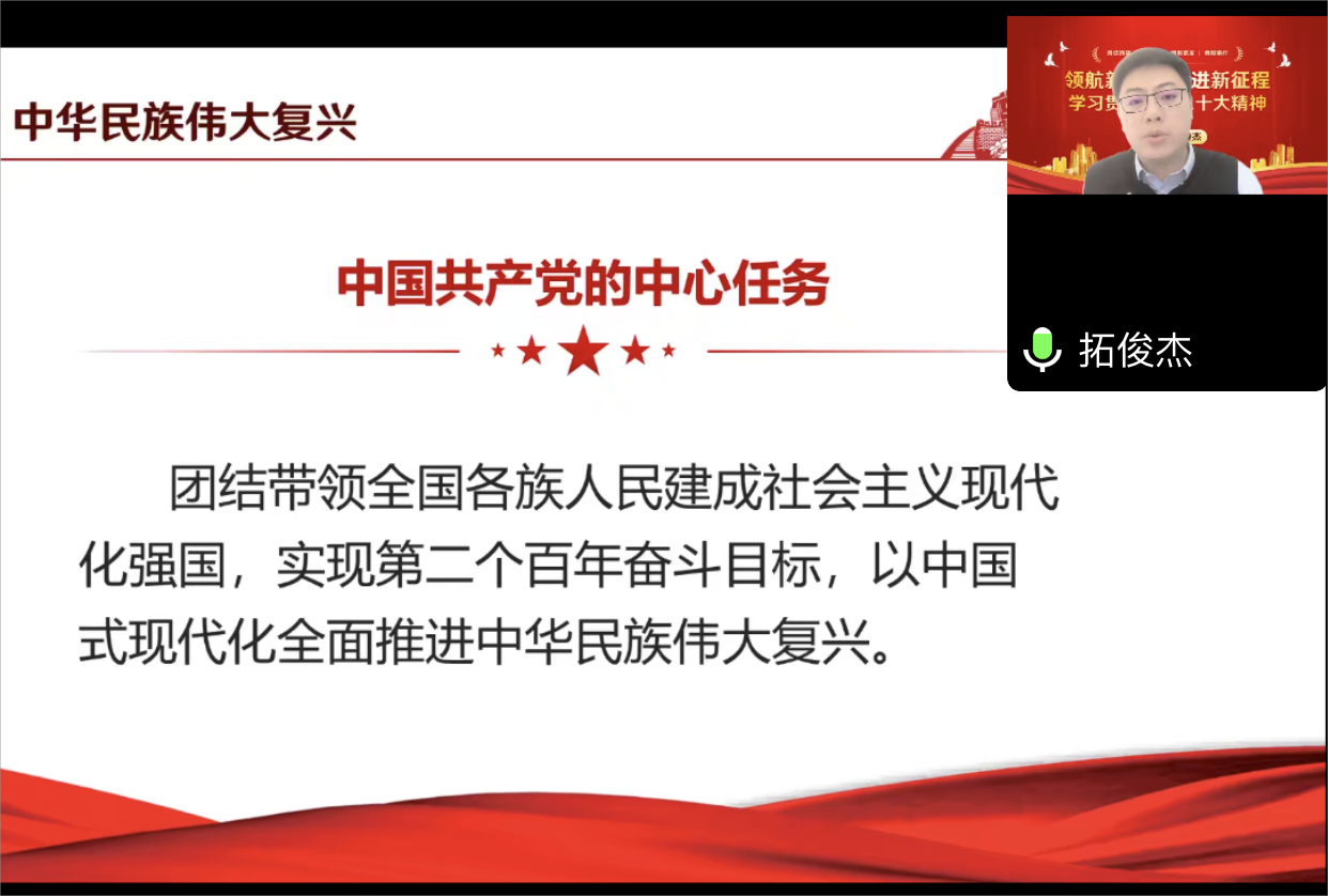 拓俊杰书记围绕深刻把握党的二十大的重要意义、深刻把握过去五年和新时代十年的伟大变革、深刻把握习近平新时代中国特色社会主义思想、深刻把握中国式现代化的中国特色和本质要求、深刻把握全面建设社会主义现代化国家的目标任务以及深刻把握以伟大自我革命引领伟大社会革命的重要要求等方面深入解读了党的二十大精神。拓俊杰书记的宣讲报告内容全面系统、重点突出,引导学员进一步深入领会党的二十大精神实质。beat365中文官方网站教将继续深入学习贯彻党的二十大精神,确保党的二十大精神在学院落地生根,推动学院实际工作。