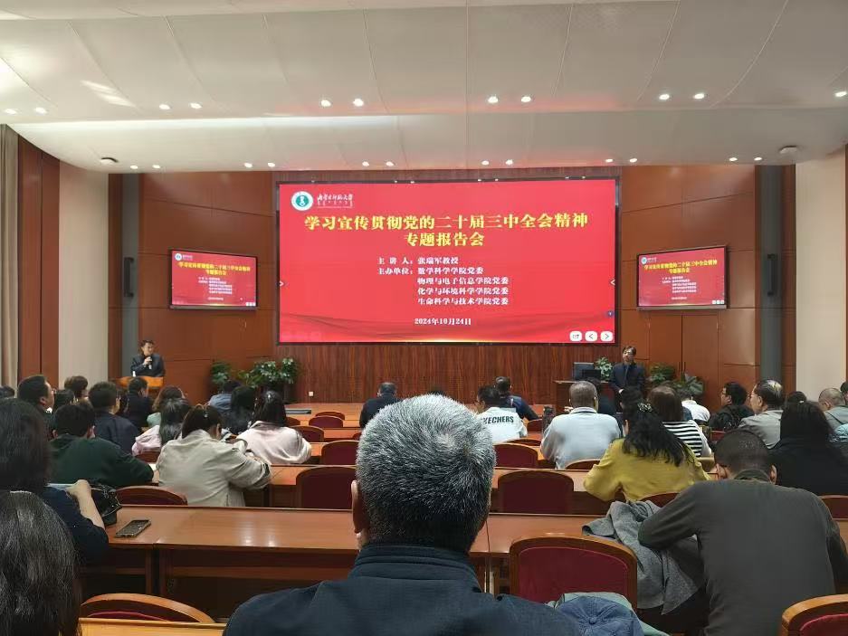 为全面深入学习贯彻党的二十届三中全会精神,深刻领会精神实质,把握核心要义,进一步把全院师生的思想和行动统一到全会精神上来。10月24日下午,beat365联合物理与电子信息学院、化学与环境科学学院、生命科学与技术学院在赛罕校区信息楼报告厅共同举办了学习宣传贯彻党的二十届三中全会精神专题报告会,会议邀请马克思主义学院党委书记张瑞军教授作专题宣讲报告,学院党委委员、班子成员,全体教职工参加学习。