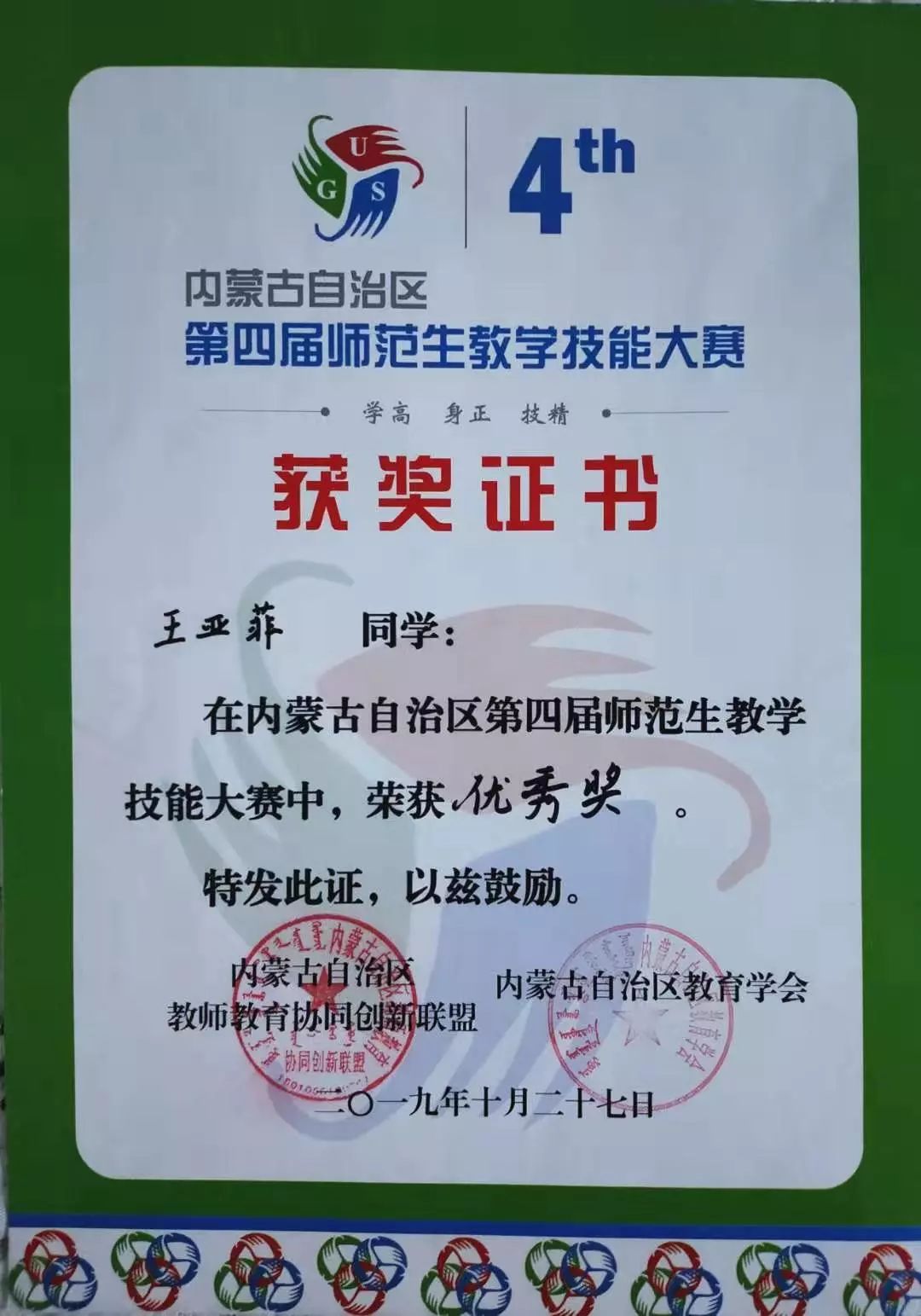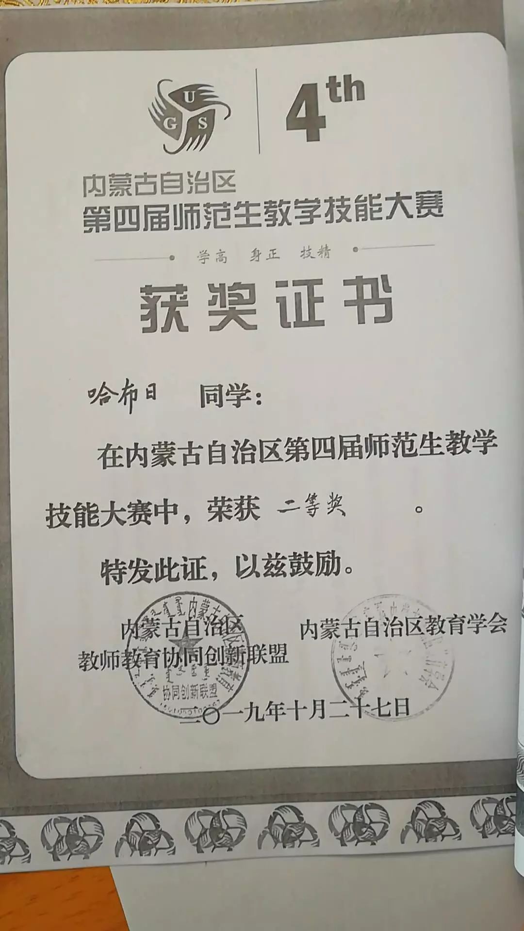 16级数学应用数学蒙班学生,2019年荣获内蒙古自治区第四届师范生教学技能大赛数学与应用数学(蒙古语)组二等奖。