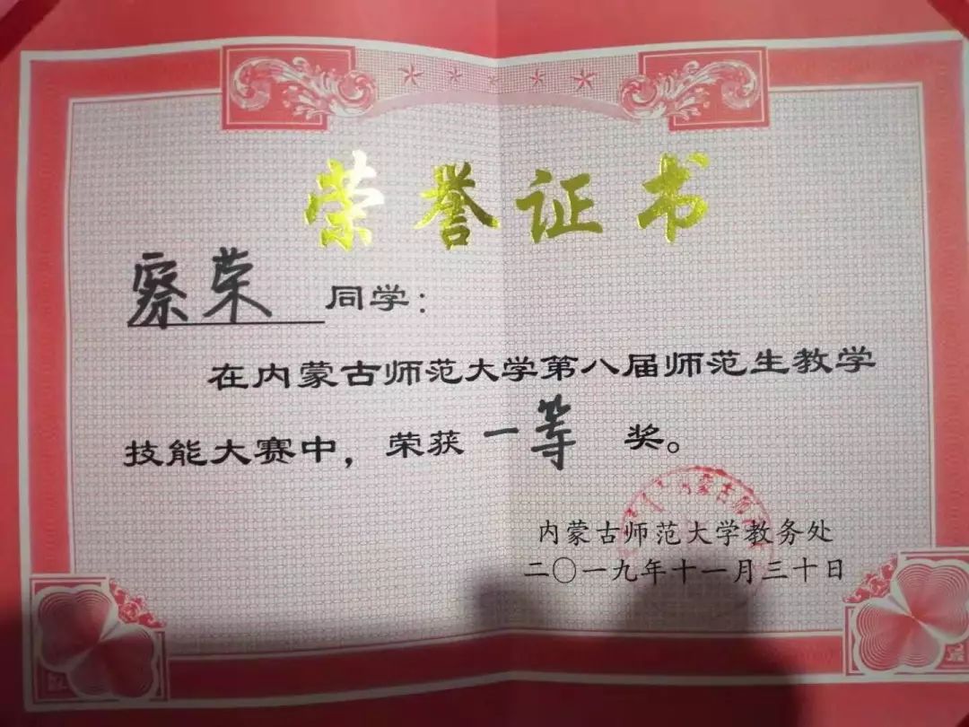 16级数学与应用数学汉班学生,2019年荣获内蒙古自治区第四届师范生教学技能大赛数学与应用数学(汉语)组优秀奖。
