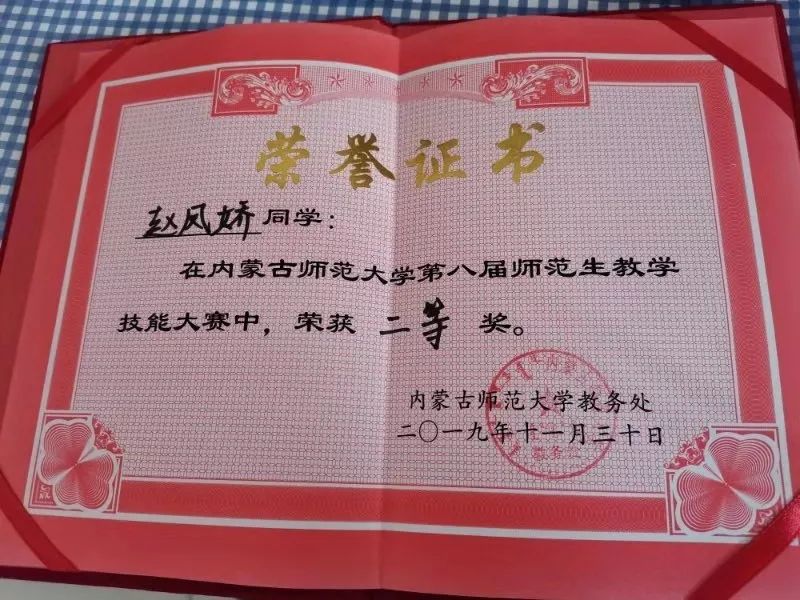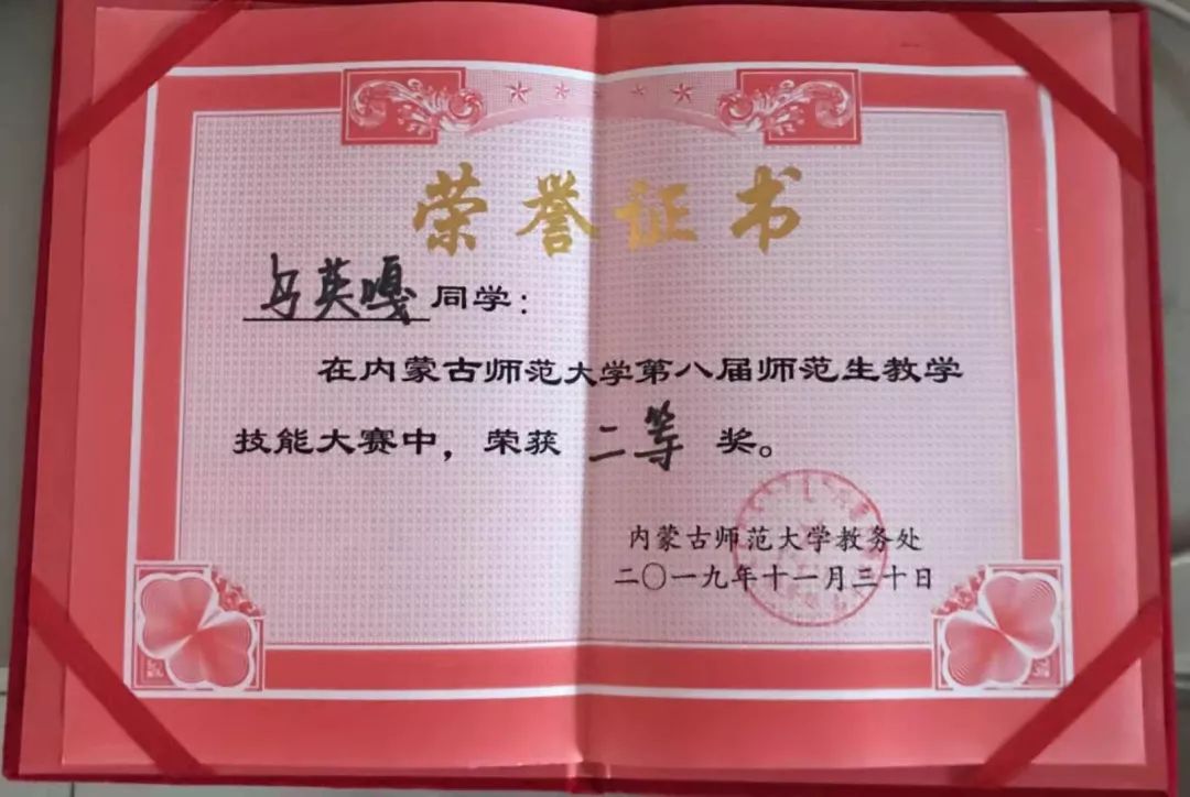 17级数学与应用数学汉二班学生,2019年荣获内蒙古自治区第四届师范生教学技能大赛数学与应用数学(汉语)组二等奖。