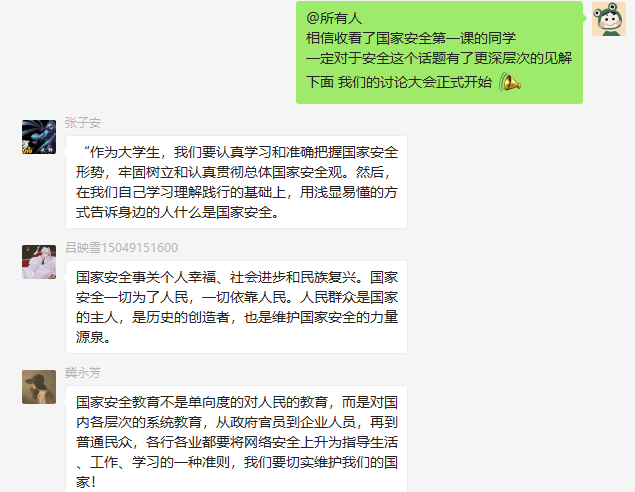 此次班会的开展,不仅让同学们掌握了更多有关国家安全教育的知识,还对同学们的价值观形成以及自身的健康发展起到了积极作用。作为一名中国公民,我们有责任、有义务维护国家安全,作为一名当代大学生,大家更要积极参与到维护国家安全的各项工作中去,尽心尽力维护校园安全,为国家安全的维护贡献自己的一份力量!维护国家安全要从你我做起!
