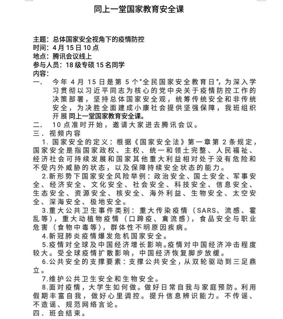 全民国家安全教育日(National Security Education Day)是为了增强全民国家安全意识,维护国家安全而设立的节日。为深入学习贯彻以习近平同志为核心的党中央关于疫情防控工作的决策部署,坚持总体国家安全观,响应国家安全教育,beat365各班级围绕“增强国家安全意识”召开主题“云”班会进行学习和交流。