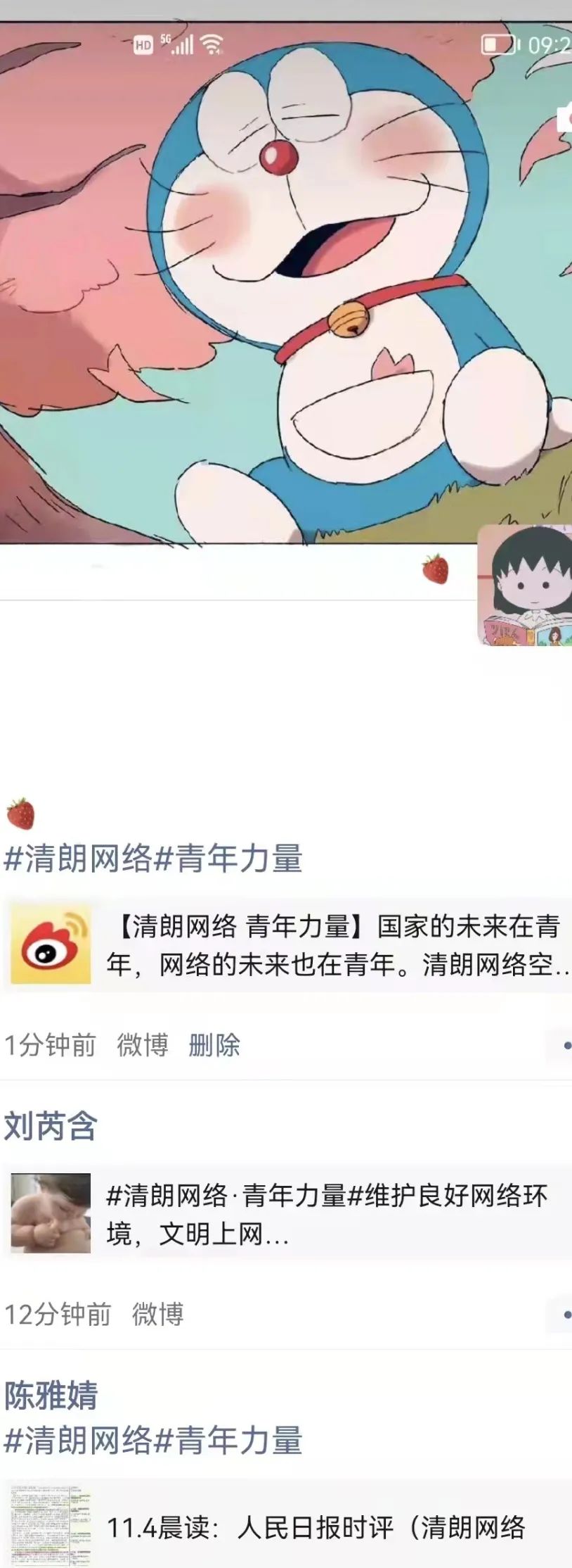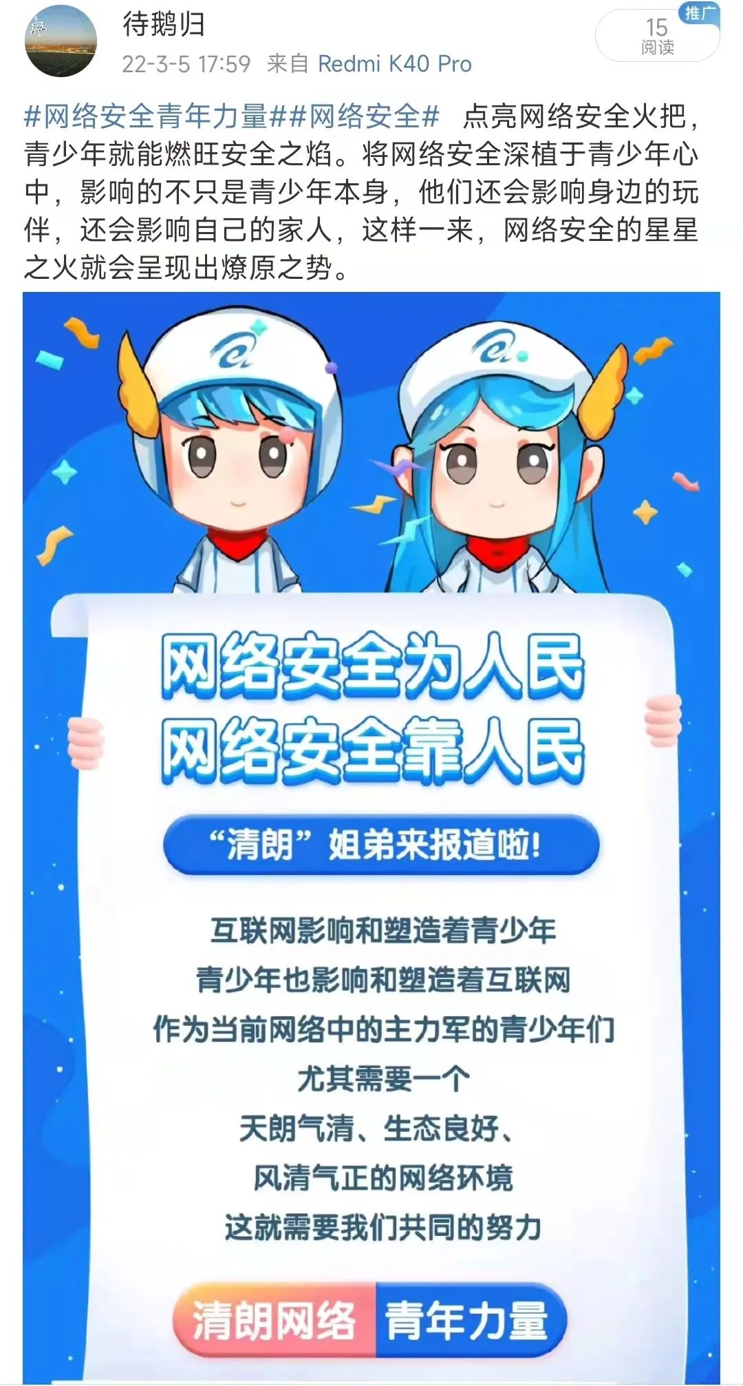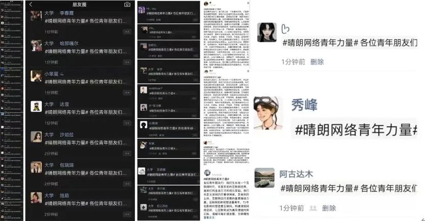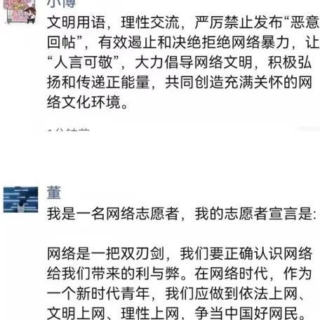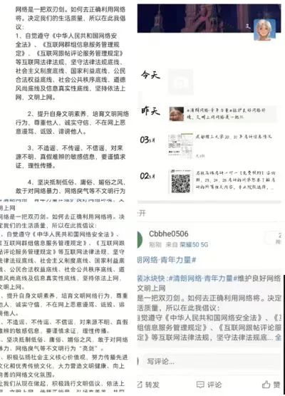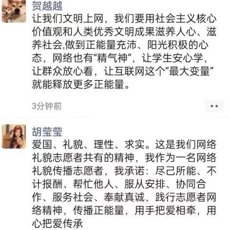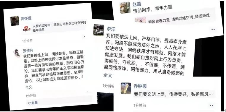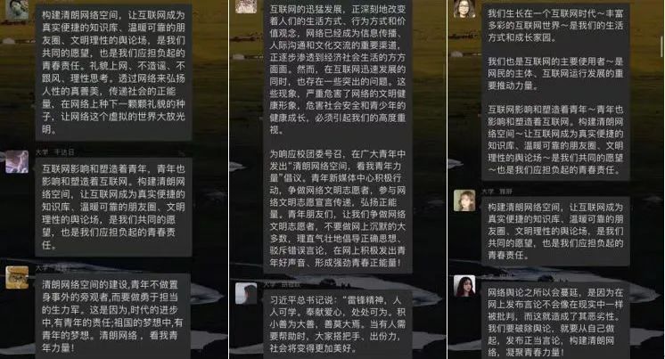 "清朗网络空间的建设,青年不做置身事外的旁观者,而要做勇于担当的生力军。这是因为,时代的进步中,有青年的责任;祖国的梦想中,有青年的梦想。清朗网络空间,看我青年力量!"
