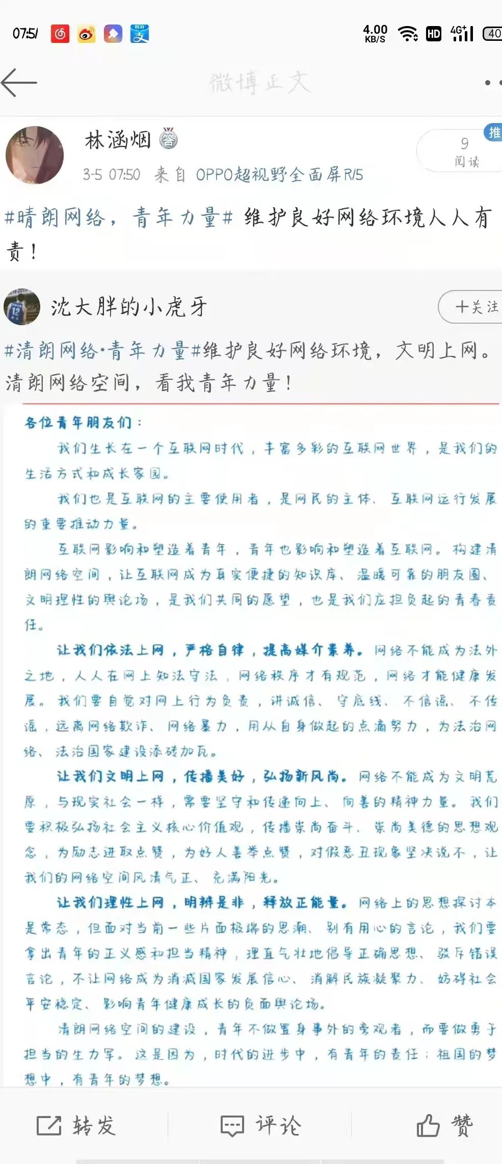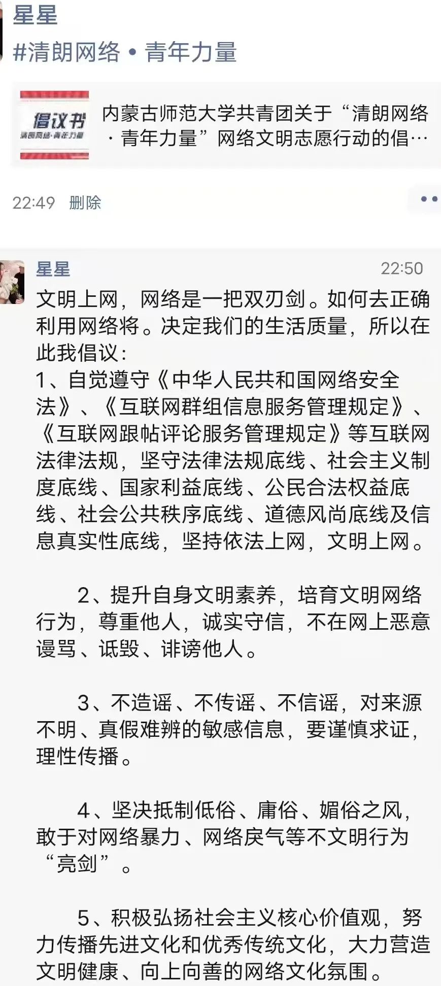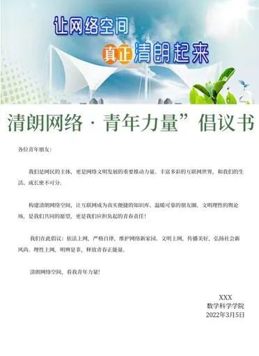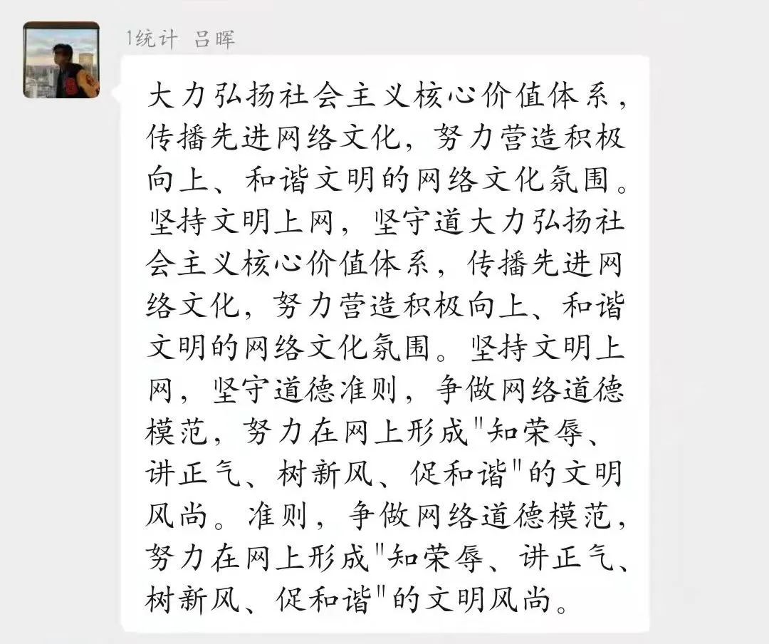 为进一步贯彻落实习近平总书记和党中央的重要要求,动员广大团员青年积极参与构建清朗网络空间,beat365中文官方网站组织各班进行了“清朗网络,青年力量”主题活动,号召大家积极按照习近平总书记提出的“勤学、修德、明辨、笃实”要求,将共青团员的先进性和担当精神延伸到网上,在网上积极发出青年好声音、形成强劲青春正能量。