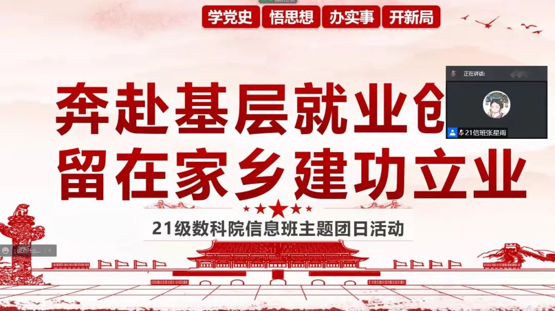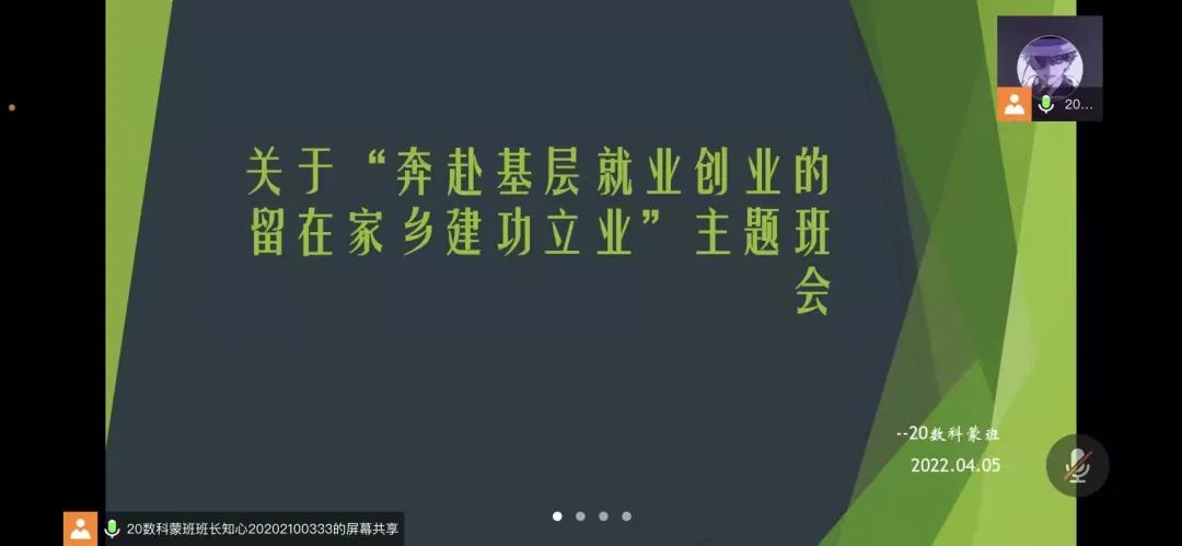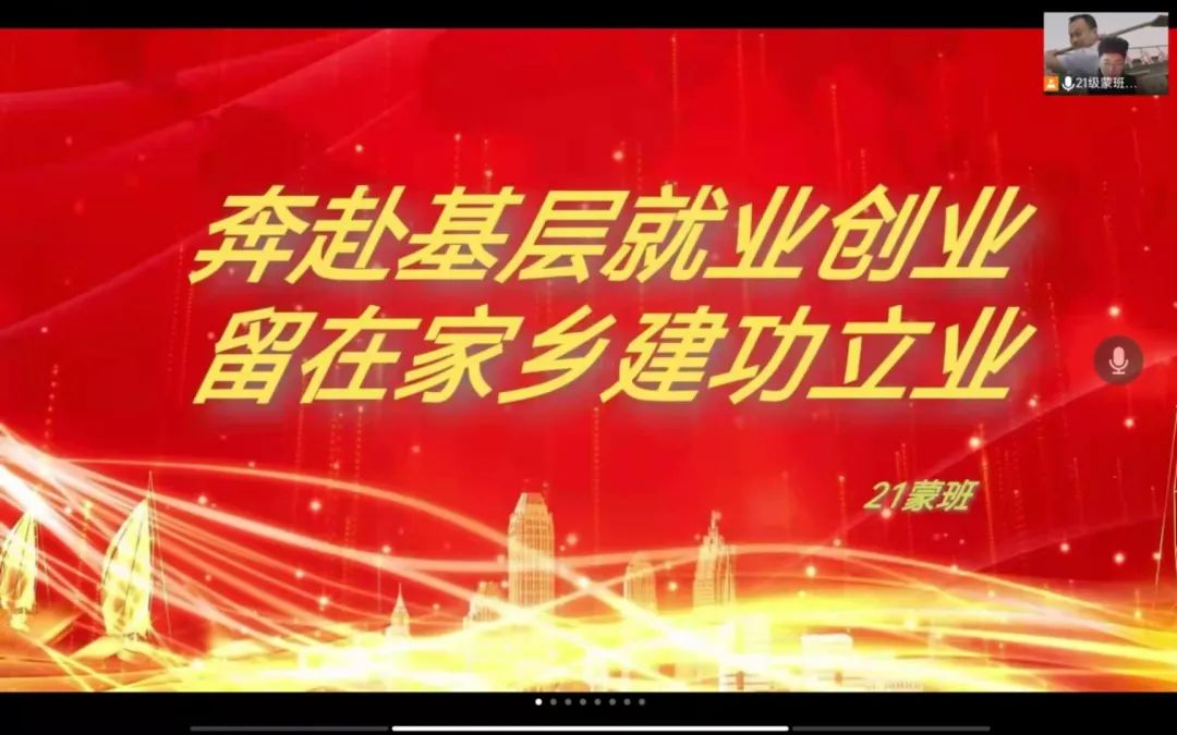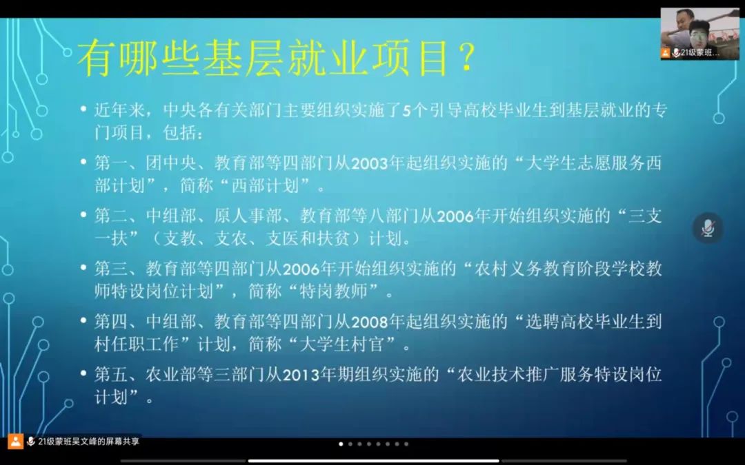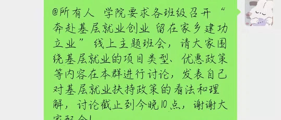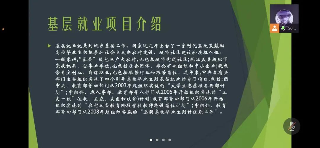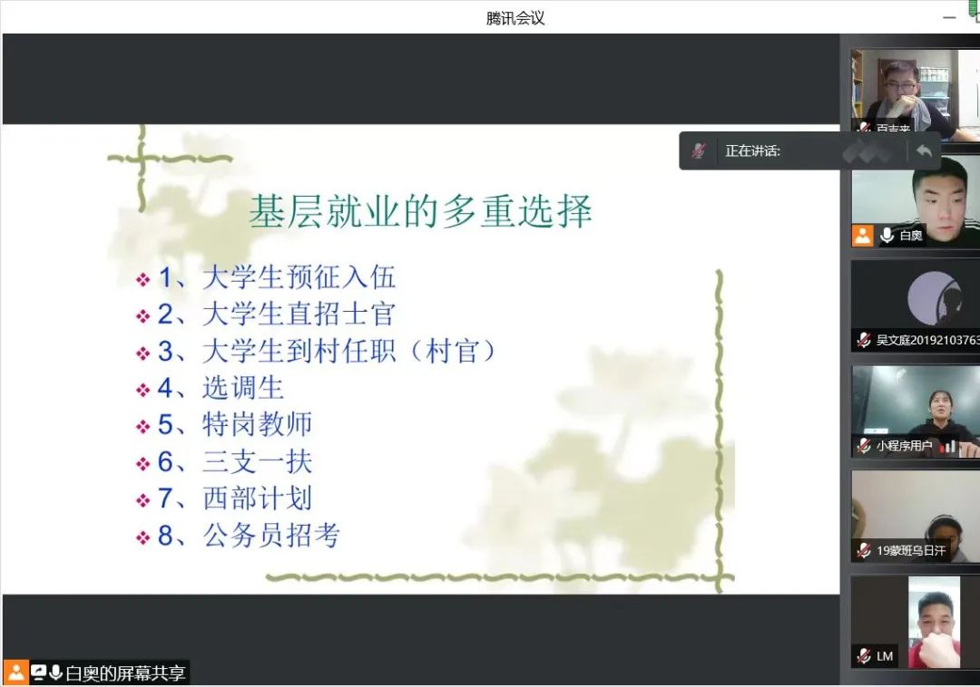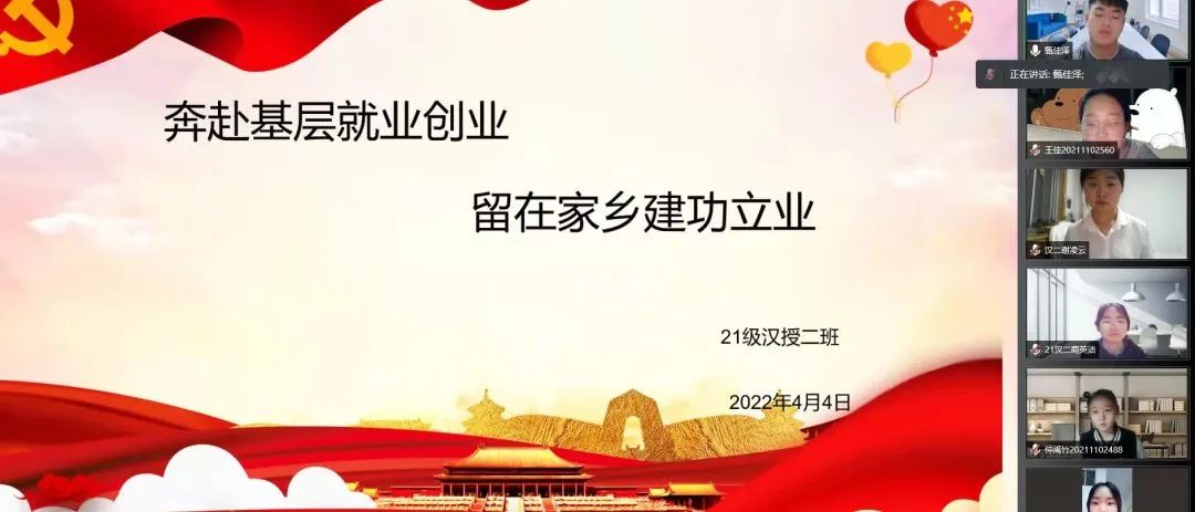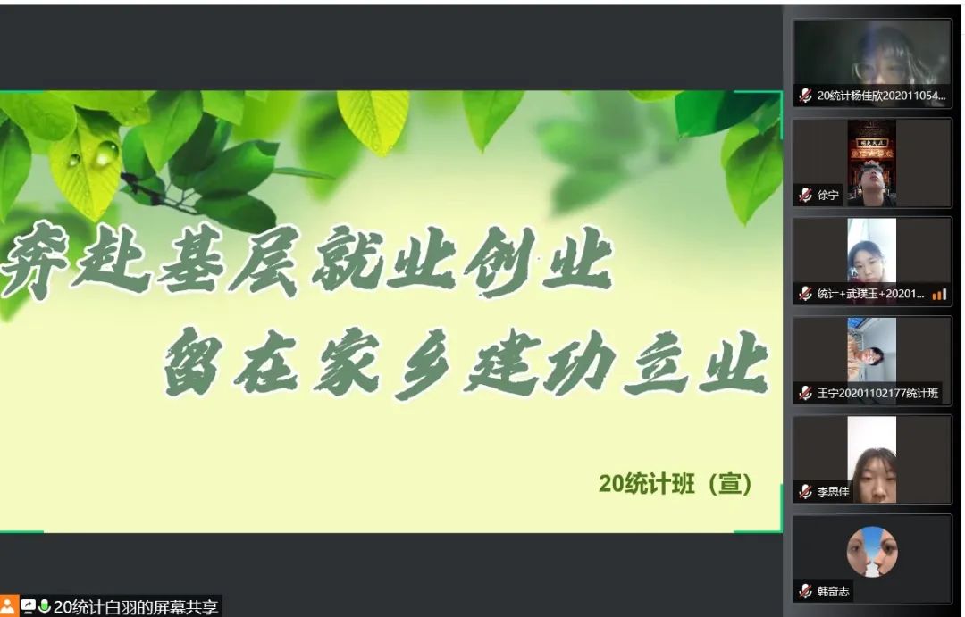 国家近几年出台了一系列优惠政策鼓励高校毕业生积极参加社会主义新农村建设、城市社区建设。为进一步让同学们了解基层就业,beat365中文官方网站各班级开展“奔赴基层就业创业,留在家乡建功立业”线上主题班会,针对基层就业的项目类型,优惠政策等内容进行学习,在充分理解基层就业扶持政策的基础上引导各班同学们加入基层就业。
