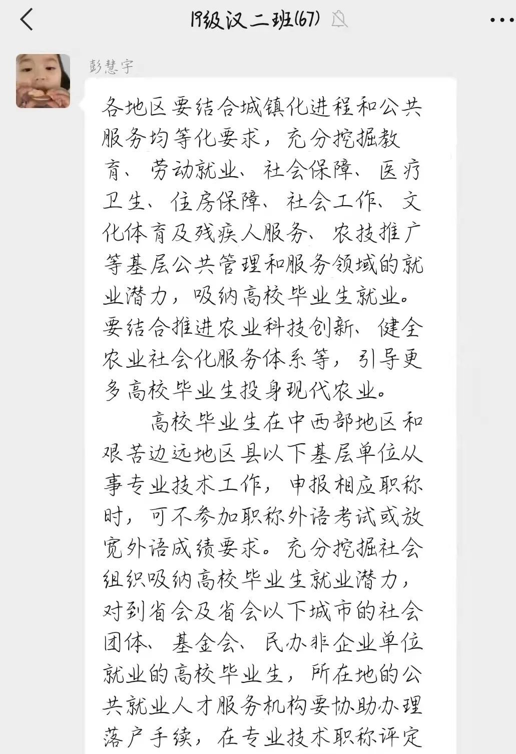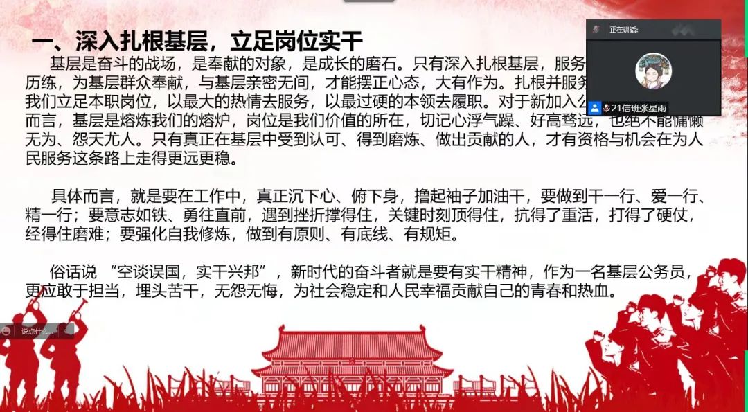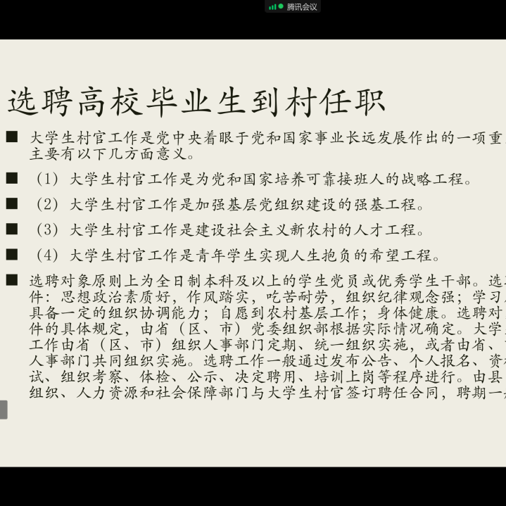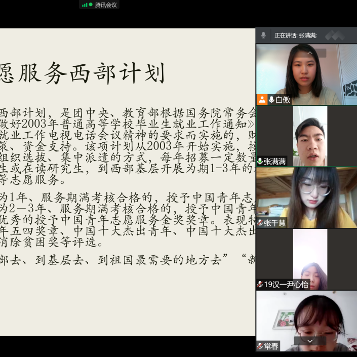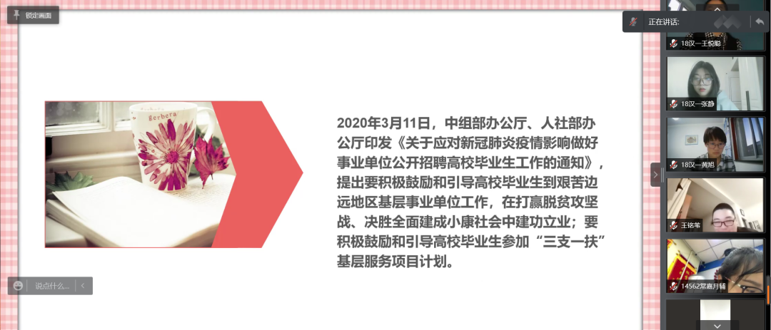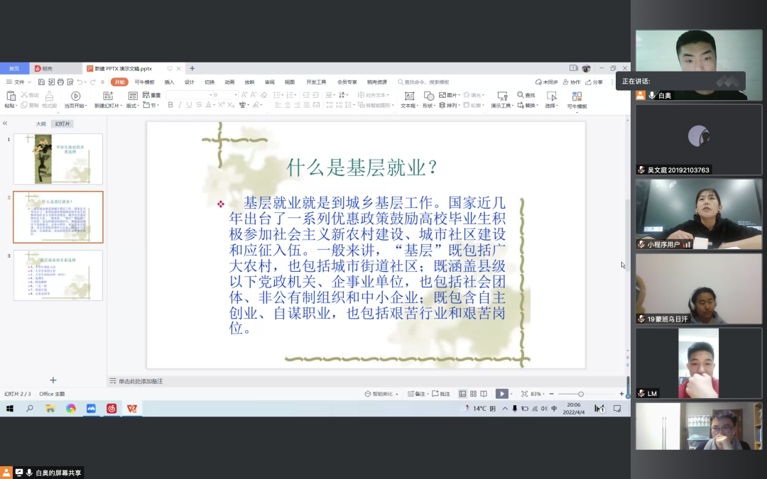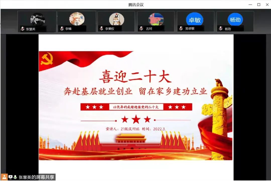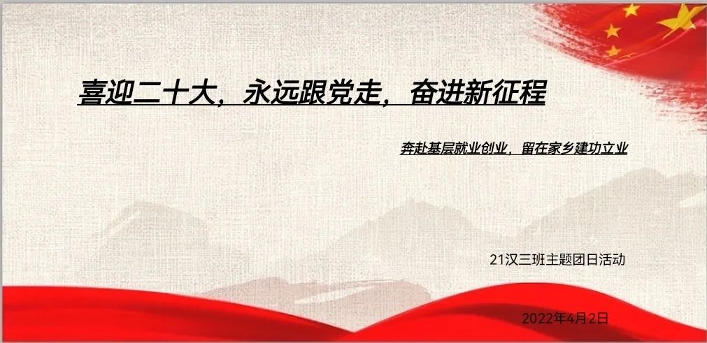 国家近几年出台了一系列优惠政策鼓励高校毕业生积极参加社会主义新农村建设、城市社区建设。为进一步让同学们了解基层就业,beat365中文官方网站各班级开展“奔赴基层就业创业,留在家乡建功立业”线上主题班会,针对基层就业的项目类型,优惠政策等内容进行学习,在充分理解基层就业扶持政策的基础上引导各班同学们加入基层就业。