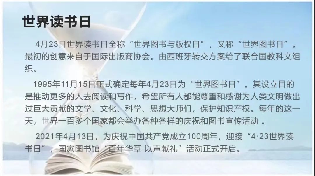 4月23日世界读书日全称“世界图书与版权日”,又称“世界图书日”。最初的创意来自于国际出版商协会,由西班牙将方案转交给了联合国教科文组织。