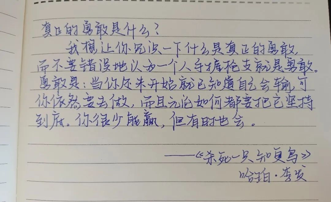 《杀死一只知更鸟》是一本关于勇气与正义的成长教科书。罗翔老师曾在《十三邀》中谈及勇气:“其实在我的词汇中,勇敢是一个高级的词汇。在人类所有的美德中,勇敢是最稀缺的。当命运之神把你推向勇敢的时刻,希望你能像你想象中那么勇敢。”我们尚且年轻,趁我们还有一腔热血,趁我们还不需要翻来覆去的考虑,趁我们还不知道什么值得什么不值得,勇敢地做自己想做的事,不畏惧挑战,更不畏惧其他人的眼光,勇敢地做,勇敢地做自己!