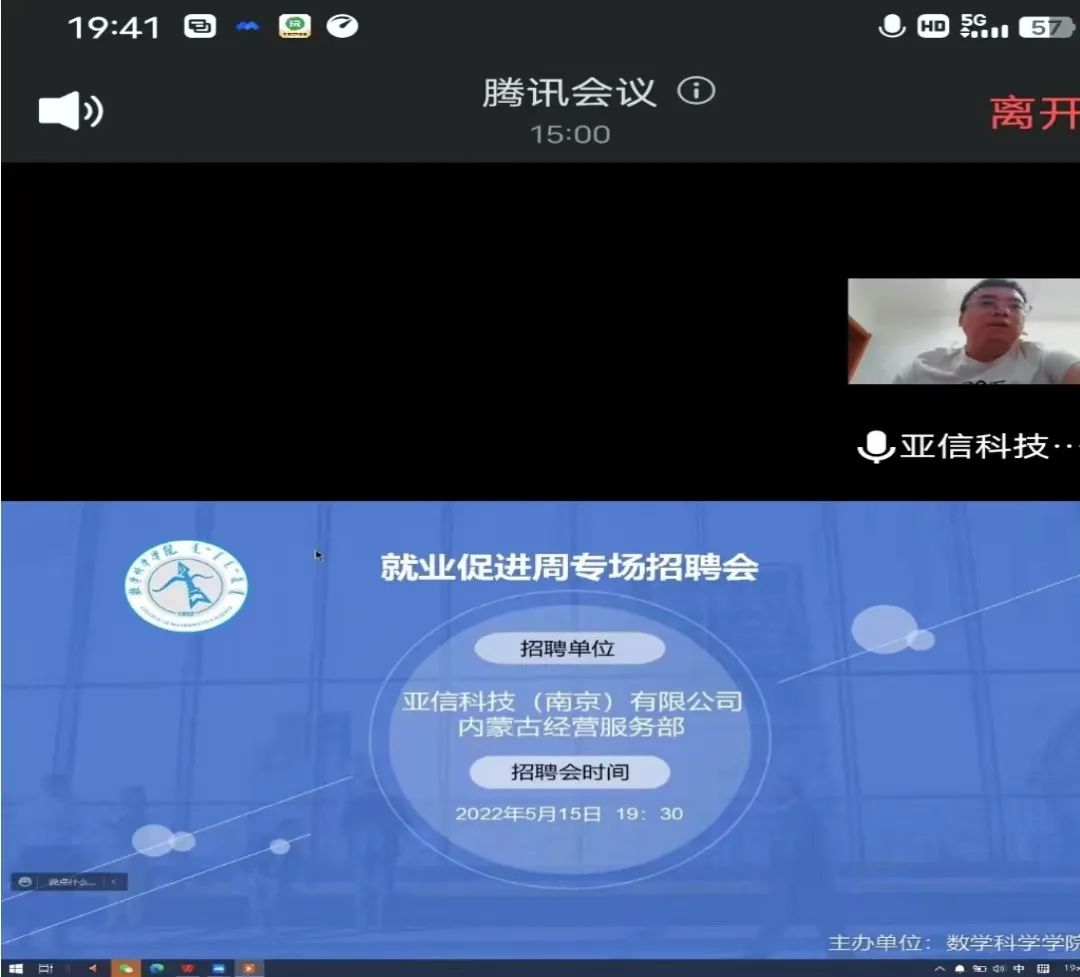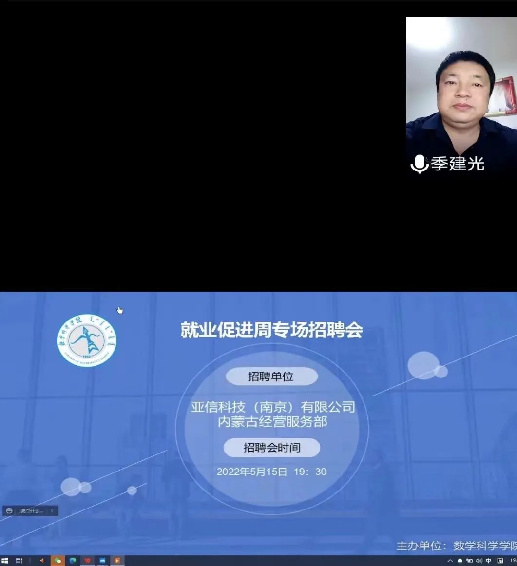 为更好的推进《beat365中文官方网站2022届毕业生就业促进周系列活动方案》的工作要求,全力促进毕业生尽早就业、顺利择业,5月15日晚,学院针对非师范专业毕业生,邀请亚信科技(南京)有限公司内蒙古经营服务部举办了“就业促进周”网络专场招聘会,学院党委副书记季建光、学生工作与就业办公室副主任刘沙沙、辅导员萨如拉以及亚信科技(南京)有限公司内蒙古经营服务部的负责人参加招聘会议,beat3652022届信息与计算科学和统计学专业的50多名毕业生参加本次招聘会。