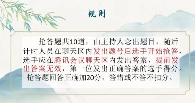 本次线上知识竞赛分为三个环节,分别为必答题环节、抢答题环节和加时赛环节,全面地考验了参赛选手们的对文学作品的知识储备量、反应能力以及临场的发挥。