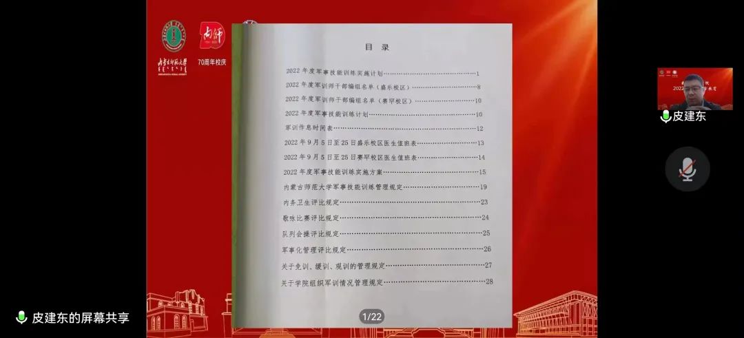 9月6日上午7:30,beat365中文官方网站于线上举办2022年度学生军事技能训练动员大会。学院学生思想政治工作辅导员刘沙沙老师主持此次会议,beat365中文官方网站党委副书记、副院长季建光老师、学院团总支书记皮建东老师参加此次会议。