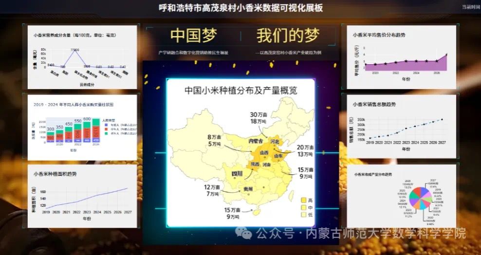 结合大学生网络博主的直播带货与社群运营,项目团队王子苗同学充分发挥大学生直播带货的优势开始了助农直播,为我们实现了小香米线上销售渠道的拓展,验证了数字化工具对农产品价值提升的显著作用。除此之外项目团队还根据调研结果,并结合所学知识提出了建立融合地域文化的“蒙香云链”故事集小程序,搭建实时数据可视化展板等举措,为农产品品牌建设提供技术支撑。