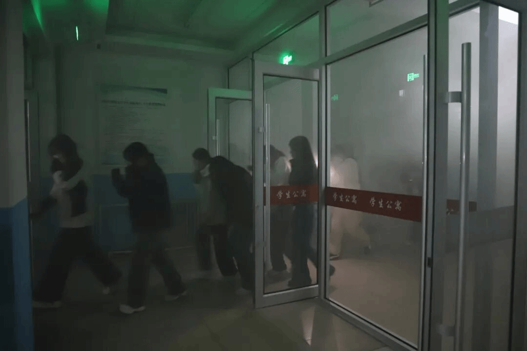 本次演练以“强化安全意识、提升应急能力”为目标,紧密结合“灭火实操+疏散逃生+安全教育”的综合安全教育模式,全面模拟真实火情场景。演练第一阶段,工作人员在宿舍楼内释放演练专用烟雾弹,模拟火灾初期的浓烟蔓延环境。随着烟感警报响起,同学们在工作人员的组织引导下,迅速反应、沉着应对,沿预定疏散路线安全有序撤离至指定区域。