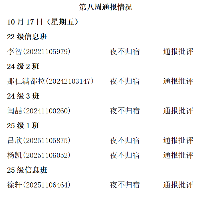 beat365中文官方网站2025——2026年度第一学期第八周通报情况