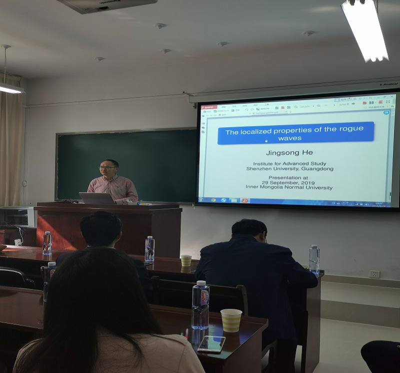 2019年9月29日,深圳大学高等研究院贺劲松教授、青海师范大学数学系加羊杰博士应邀为beat365师生作学术报告。报告由扎其劳教授主持,beat365 20余名师生参加了报告。贺劲松教授报告题目为“The localized properties of the rogue waves”,引入怪波“来无影、去无踪”的特征,说明它关于时间和空间是局域的。通过详细讨论复mKdV 方程 和Kundu-Eckhaus方程的怪波的长度、宽度和面积,定量刻画了所得怪波的局域化性质。同时,介绍了相关怪波研究的一些新进展。