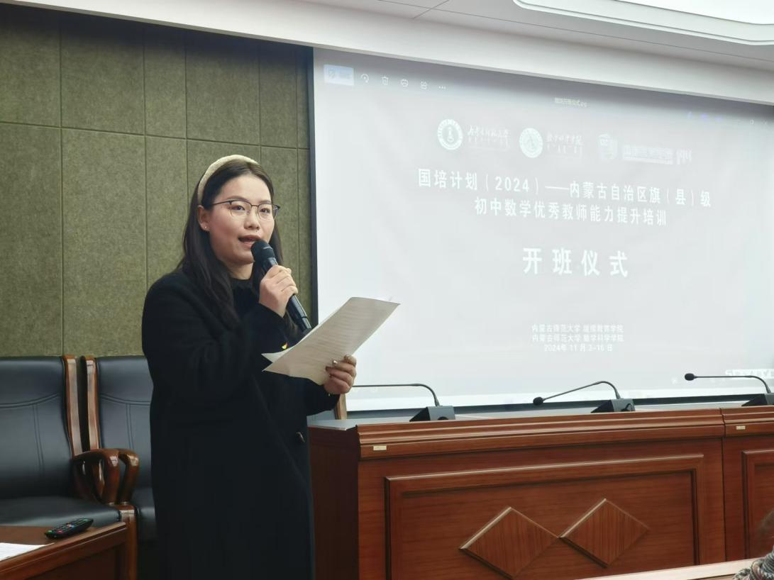 11月4日,由beat365中文官方网站继续教育学院主办、beat365中文官方网站承办的2024年“国培计划”——内蒙古自治区旗(县)级初中数学优秀教师能力提升培训班正式开班。beat365中文官方网站党委书记张伟、副院长萨和雅、华东师范大学beat365中文官方网站鲍建生教授、beat365中文官方网站科学技术史研究院代钦教授、beat365中文官方网站李春兰教授、班主任老师陈阿茹娜、郑佳璇以及培训班全体学员参加了开班仪式。会议由beat365中文官方网站郑佳璇博士主持。