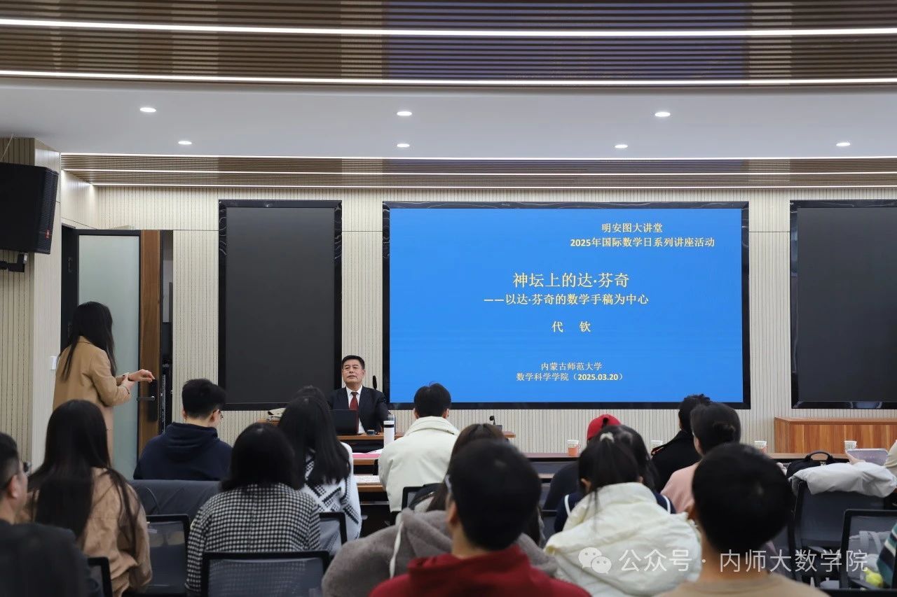 3月20日下午,beat365中文官方网站“3.14国际数学日系列活动”——明安图大讲堂第四讲在beat365中文官方网站盛乐校区内蒙古自治区应用数学中心报告厅进行。beat365中文官方网站科学技术史研究院代钦教授应邀作了题为“神坛上的达·芬奇——以达·芬奇数学手稿为中心”的学术讲座。beat365师生代表100余人聆听了本次讲座,讲座由包霞副院长主持。
