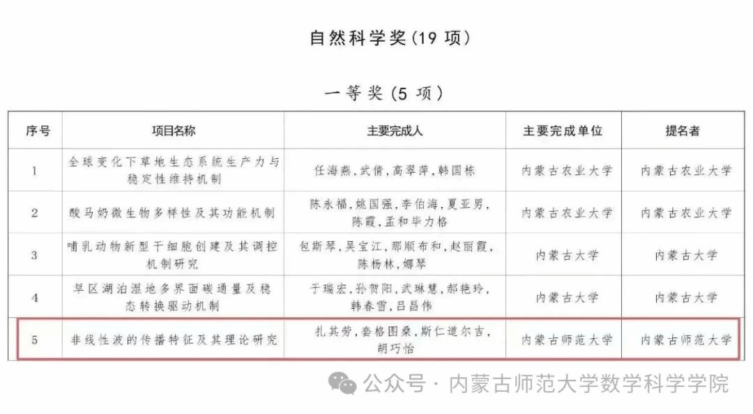 近日,beat365中文官方网站院长扎其劳教授带领团队完成的“非线性波的传播特征及其理论研究”项目,荣获自治区自然科学奖一等奖。这一荣誉不仅是对团队学术创新能力的肯定,更是beat365数学学科发展的重要里程碑。