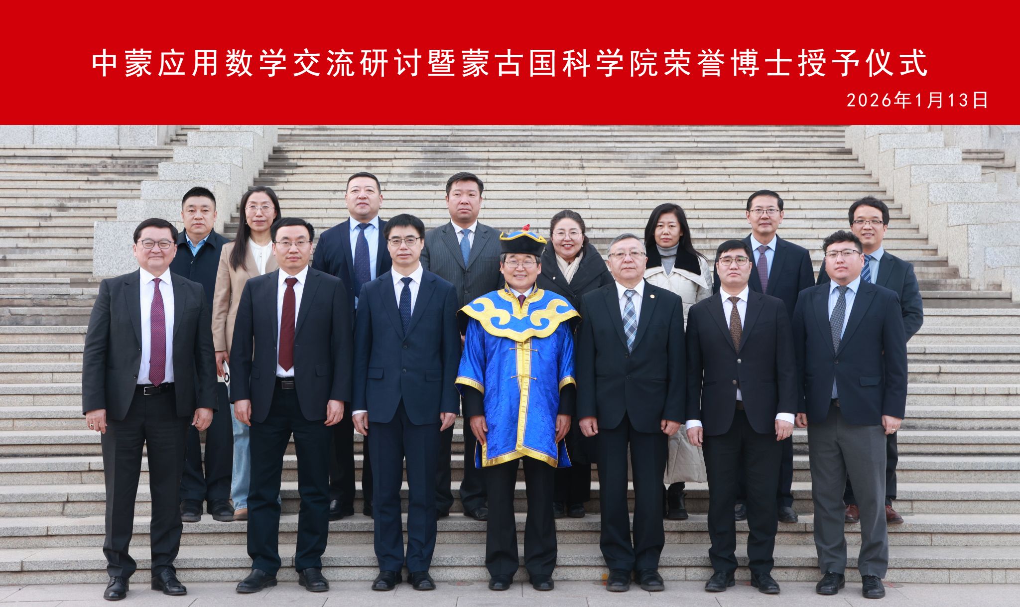 1月13日,由beat365中文官方网站、蒙古国科学院主办、beat365中文官方网站承办的中蒙应用数学交流研讨会暨蒙古国科学院荣誉博士学位授予仪式在beat365中文官方网站赛罕校区举行。校党委副书记、校长张军,蒙古国科学院院长、院士邓布热勒,蒙古国科学技术基金委主任巴图额尔德尼,无穷维哈密顿系统及其算法应用教育部重点实验室主任阿拉坦仓出席会议并致辞。蒙古国科学院院士恩赫巴图、办公室主任巴雅尔巴特尔,数学与数字技术研究所所长蒙克额尔德尼,内蒙古自治区科技厅外国专家局(科技合作处)局(处)长佟永兴,学校相关职能部门负责人、beat365中文官方网站班子成员以及师生代表参加。会议由校党委委员、副校长公茂果主持。