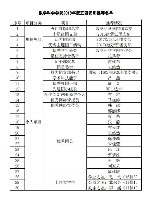 依据《关于开展2018年度“五·四”系列表彰的通知》(内师团发〔2019〕 号),按照《beat365中文官方网站团员手册》有关规定开展评选活动,现将推荐名单公示如下: